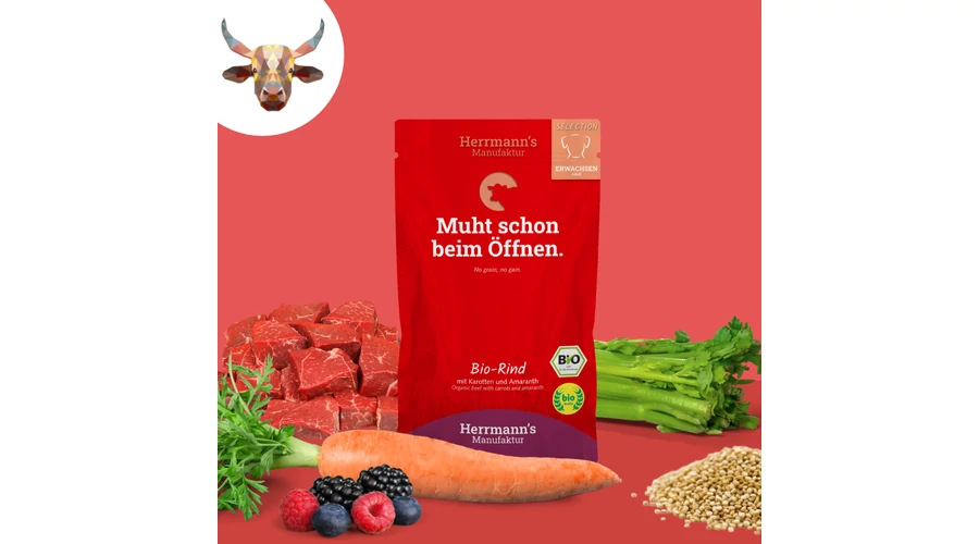 Bio marhahús párolt menü kutyáknak - bio sárgarépa, bio amaránt 150 g, Herrmanns